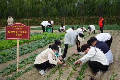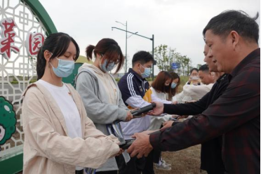 党课结束后,文伟村老党员手把手将农具交给各学生党支部代表,象征着红色精神从上一代向年轻一代的传承。各学生党支部按随机原则认领了各自的“责任田”,其中学生第一党支部、研究生第二党支部认领“党建菜园”菜地种植工作;学生第二党支部、学生第三党支部、研究生第一党支部认领“示范农田”稻谷收割工作。