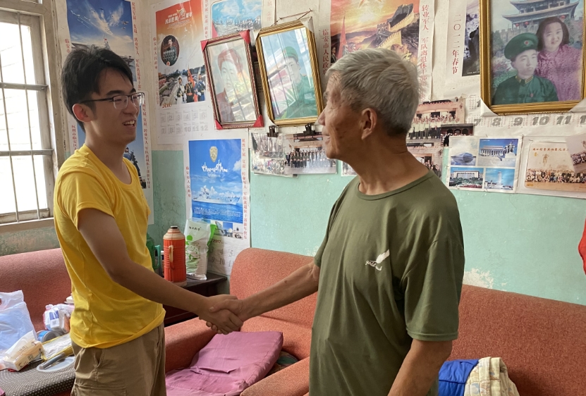 7月13日上午,在村子负责人的带领下团队踏入了九旬老兵——潘涛老先生的家门。款式老旧的电风扇与沙发、贴满墙壁的党建挂历,进入这小小房间的一刹,学生们似乎随潘老先生一同回到了过去。潘老先生热情地展示自己曾获得的奖章,随后开始滔滔不绝地讲述过去的故事。言到人民生活在党的带领下所发生的变化时,他不禁潸然泪下,一时无言。只有那台破落电视机里传来的的中国外交部的坚定声音,翻涌着在场所有人的心绪。临别之际,潘老先生再三嘱托:“作为年轻党员,应不忘初心,积极奋进。”言简意赅,却字字铿锵入心。凤凰山脚下的这小小一隅村落,见证了党员前辈的奋进。苍翠山间,仍回荡着“为人民服务”的余音。