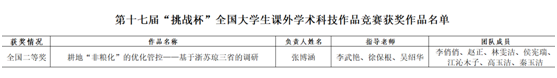 19级研究生张博涵团队的作品《耕地“非粮化”的优化管控——基于浙苏琼三省的调研》(指导老师:李武艳、徐保根、吴绍华)荣获全国二等奖,为学校在该项赛事取得历史性突破。