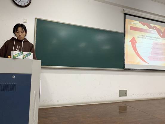17公管学生第一党支部李梦琪结合PPT,为大家总结了十九届四中全会精神。她先是简单介绍了十九届四中全会,对其中重要精神进行传达,总结了推进国家治理体系和治理能力现代化为会议中心,梳理了我国国家制度和国家治理体系具有的十三方面的显著优势,增强了同学们的制度认同感,让同学们对于国家下阶段的工作方向有了进一步的了解。