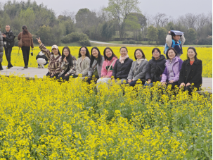 在钟家港古河道,教职工们驻足考古剖面与复原文物展陈区,结合水利工程、城市规划等学科背景,探讨良渚先民“以水为脉”的生态治理智慧;莫角山宫殿遗址的巨型夯土台基前,大家围绕“草裹泥”技术展开热议,赞叹古人因地制宜的创造力。漫步在古城外的千亩油菜花田,金浪翻滚的花海与遗址的苍茫土色形成鲜明对比,古朴的莫角山宫殿群与绚丽的春景同框,构成跨越五千年的时空对话。