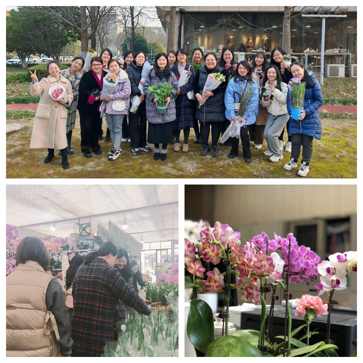 女教职工一同前往杨家花卉市场,参观了花卉市场的各个区域。在这里,各种花卉竞相绽放,色彩斑斓,香气四溢。女教职工们积极请教与交流,了解了各种花卉的生长习性、养护技巧和市场行情,并挑选自己喜欢的绿植花卉等,装饰家庭与办公环境。