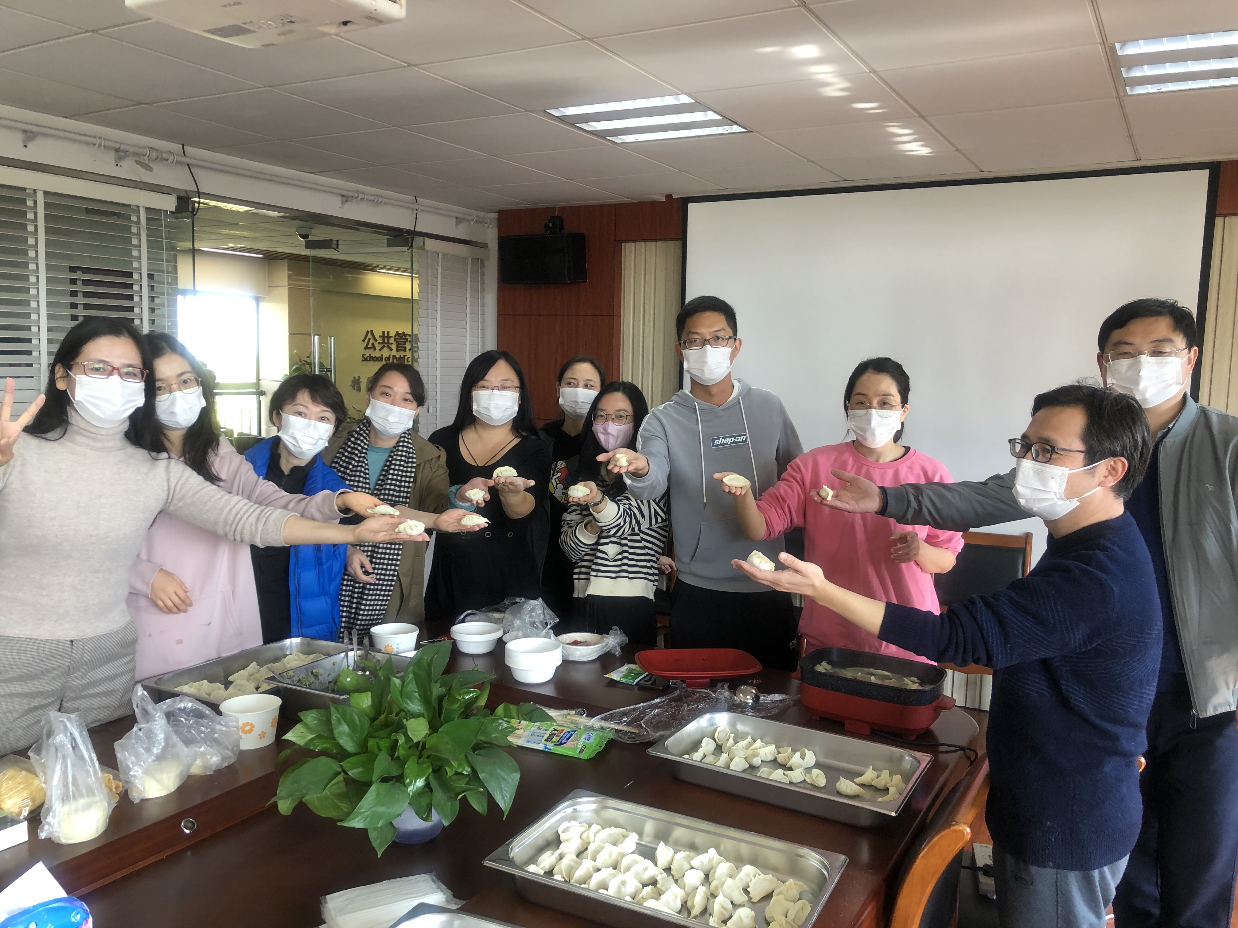 老师们自带提前准备好的各式美食,有甜品糕点、自制炸虾、手工营养蛋饼、手工水饺等,现场大家一起分享包饺子手法,大家相互品尝、分享,活动场面气氛融洽、热闹非凡。