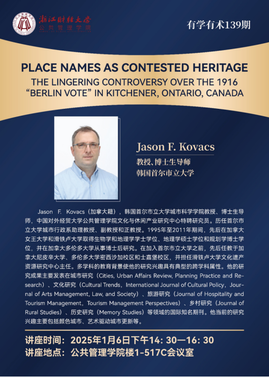 有学有术系列讲座第139期在1号楼517C会议室举行。此次讲座的题目为Place names as contested heritage: the lingering controversy over the 1916 “Berlin vote” in Kitchener, Ontario, Canada,由韩国首尔市立大学Jason F. Kovacs教授主讲,学院副院长黄志岭主持。Jason F. Kovacs教授的讲座揭示了城市地名变迁的复杂性,强调了地名作为竞争性文化遗产在塑造集体记忆中发挥的重要作用。