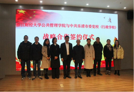 与乐清市委党校(乐清市行政学校)战略合作签约仪式暨浙江财经大学地方政府与城乡治理研究院乐清民营经济研究中心授牌仪式、浙江财经大学博士驻乐清市委党校工作站启动仪式在乐清举行。中共乐清市委常委、组织部部长、党校(行政学校)校长郑翔,院长郭剑鸣,院党委书记林亚芳等出席仪式。