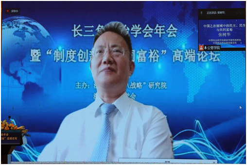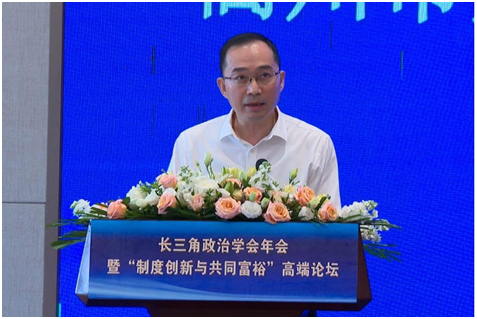 张树华代表中国政治学会对论坛的举办表示祝贺。他表示共同富裕是中国特色社会主义的重要特征,也是党和人民的不懈追求。浙江省承担了高质量发展建设共同富裕示范区的重要使命,希望长三角学界同仁共同行动起来,从制度建设与创新层面出发,为扎实推动共同富裕和长三角一体化协同发展提供高质量智力支持。