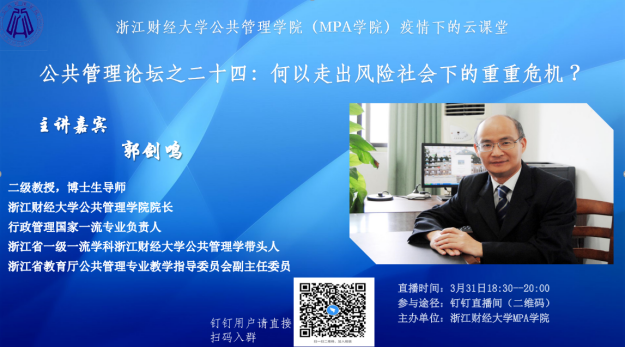 为积极落实教育部疫情防控工作要求,将“停课不停教,停课不停学”的指导意见落到实处。3月31日晚,郭剑鸣院长就MPA学子关心的疫情热点作了一场题为“何以走出风险社会下的重重危机?”的学术报告。钉钉直播间观看学生达527人,点赞超1000。