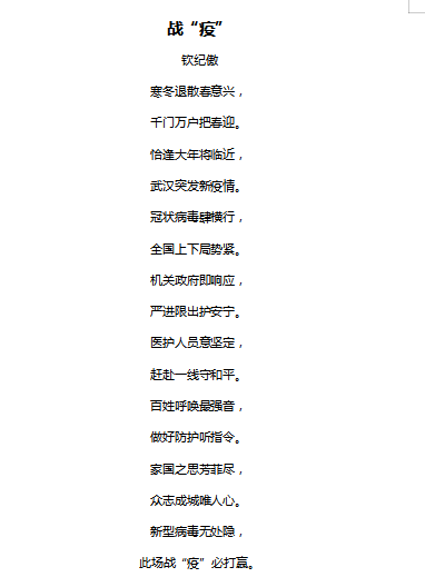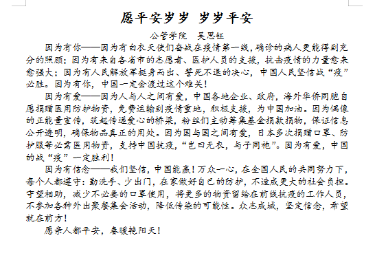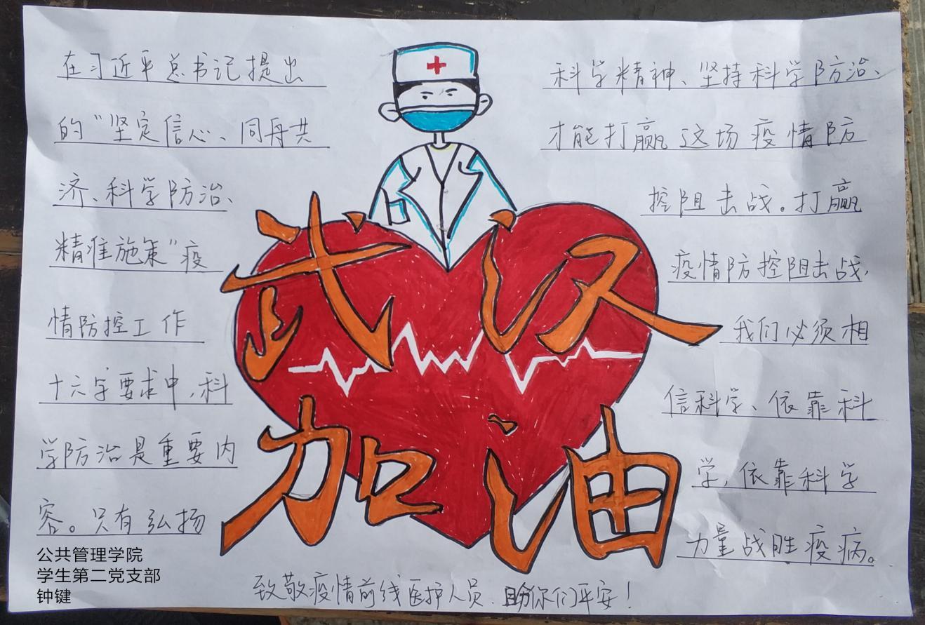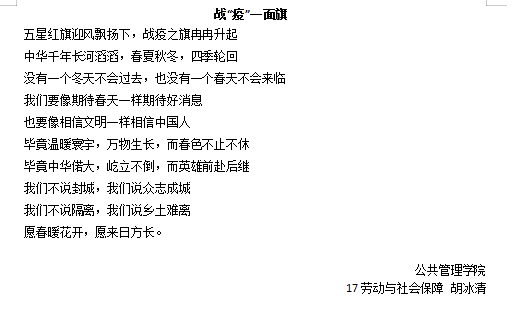 在学生党员和入党积极分子的带动下,同学们创作了许多令人动容的作品,他们通过手中的画笔,绘出胜利的希望;通过坚定的誓言,抒发必胜的信心;通过优美的诗歌,歌颂一线抗“疫”战士,为他们呐喊,为他们加油……一篇篇文字、一幅幅画报、一段段视频,展现了公管学子心系天下的担当精神,表达了莘莘学子对抗“疫”人员的崇敬与感恩。