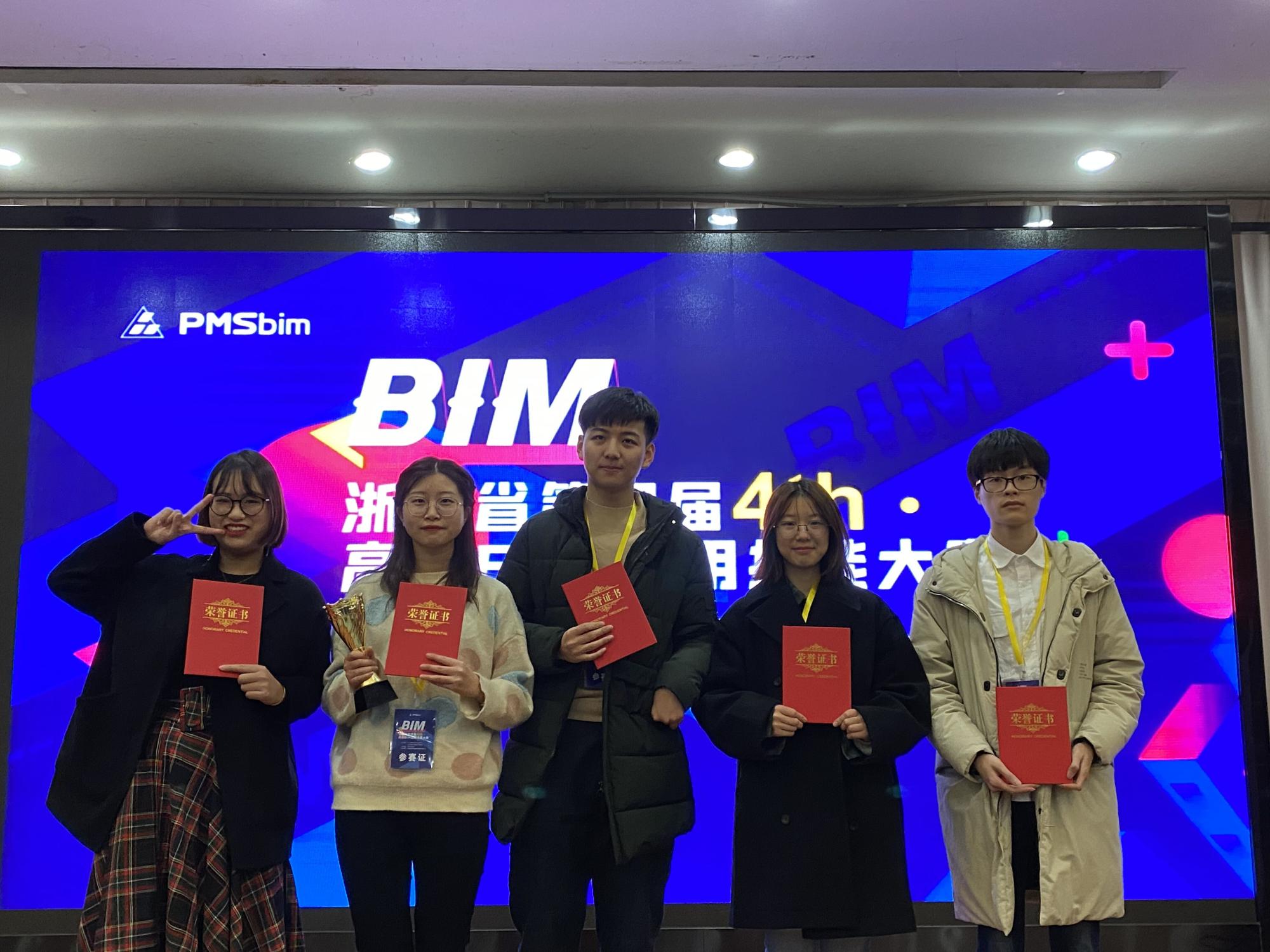 陈芝伊、庄婷、安梓豪和李冉然、朱千谦、包轶帆同学组成的两组代表队分别荣获团队一等奖和三等奖的好成绩,其中陈芝伊、庄婷、安梓豪代表队荣获BIM项目管理专项一等奖。