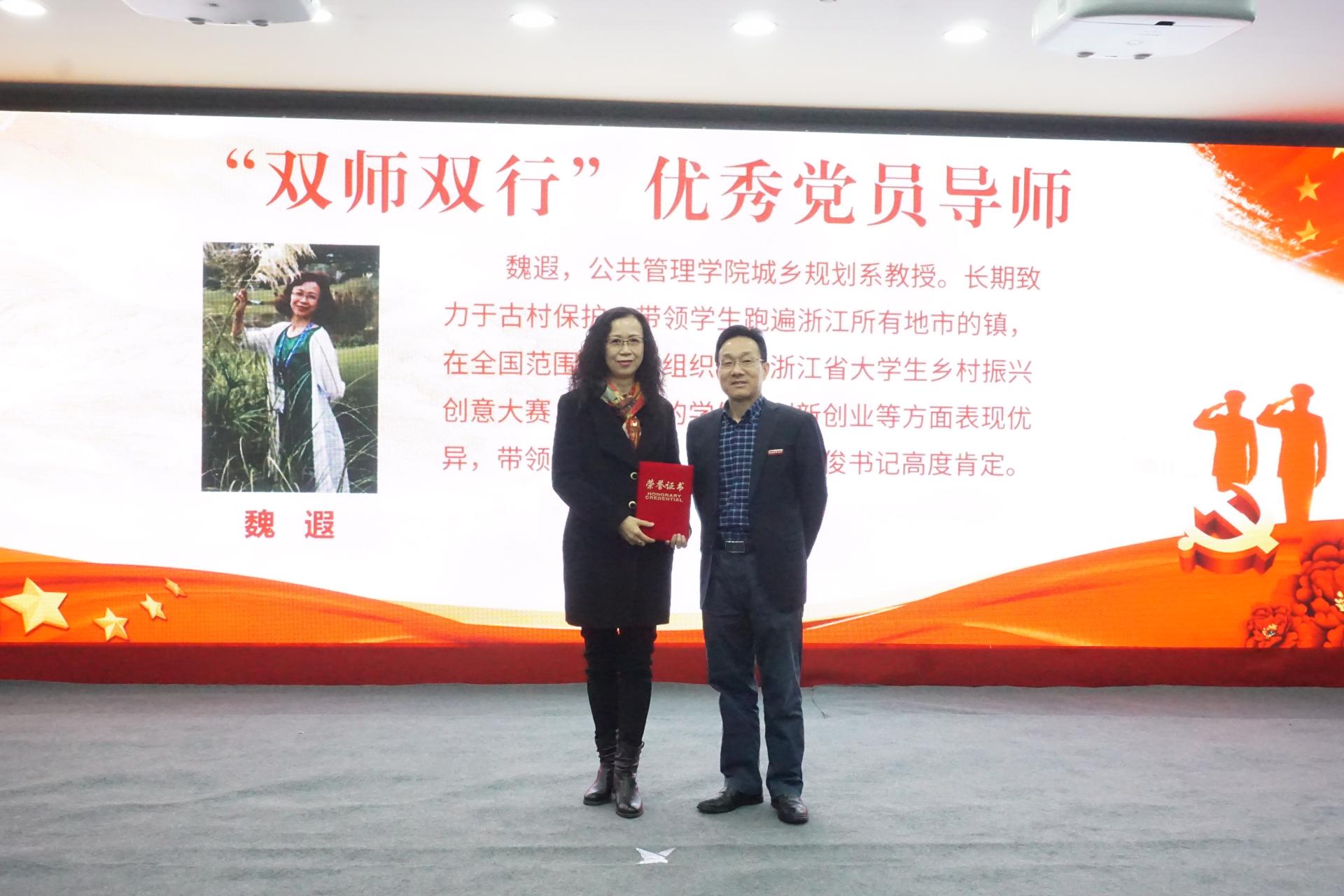 在表彰先进环节通过视频短片回顾学院“双师双行”党建育人基本情况,表彰了优秀党员导师魏遐、彭毅,优秀朋辈导师陈俊宇、胡文涛、娄云子,优秀实践服务团队“淳安支教”团队。与会领导分别为优秀个人和团队颁奖,并共同上台揭晓最新的“双师双行”实践服务基地分布图。