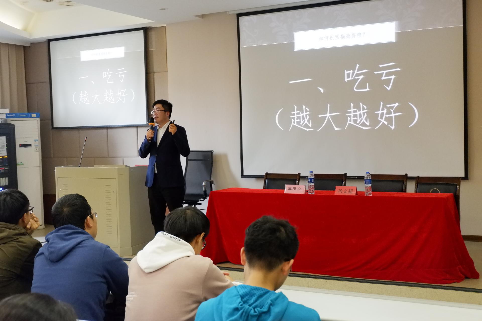 杭州校友分会常务副会长、杭州宝柏投资基金管理有限公司执行董事王思立,还于当天下午在学院208报告厅作了“榜样力量”主题报告会,围绕大学生的学业、职业规划等热点话题与在校生分享了自己的经历、经验和感悟,为同学们提供了很多很好的思路和建议,同学们纷纷表示受益匪浅。