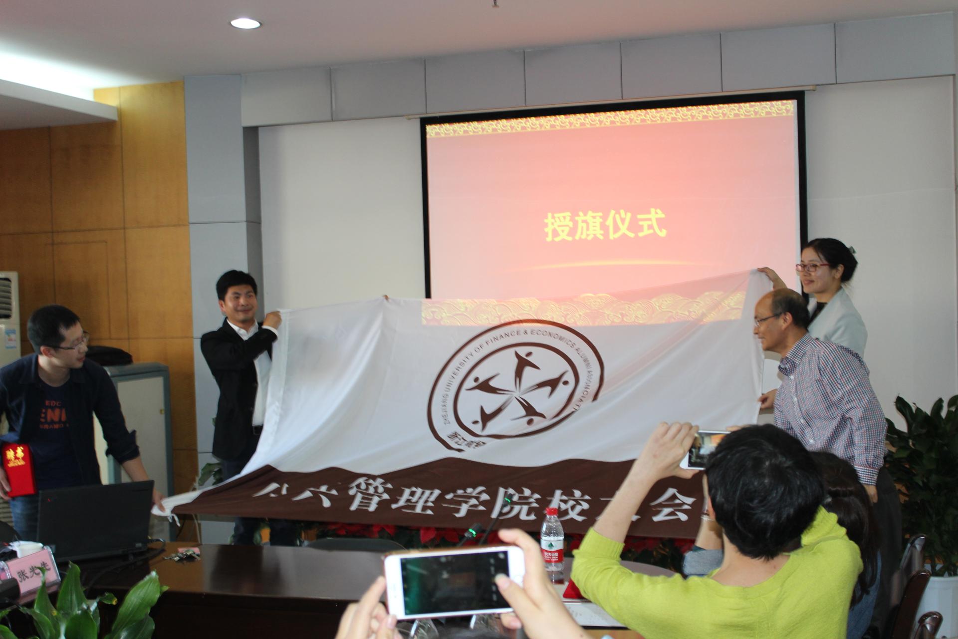 校友会章程,通过了校友会会长、执行会长、副会长、秘书长、副秘书长名单,通过了校友会理事会名单。学院领导郭剑鸣、沈晓敏分别为校友会会长、副会长颁发聘书,并共同为会长授旗。学院领导王直民、裴志军共同为校友会副秘书长颁发聘书。