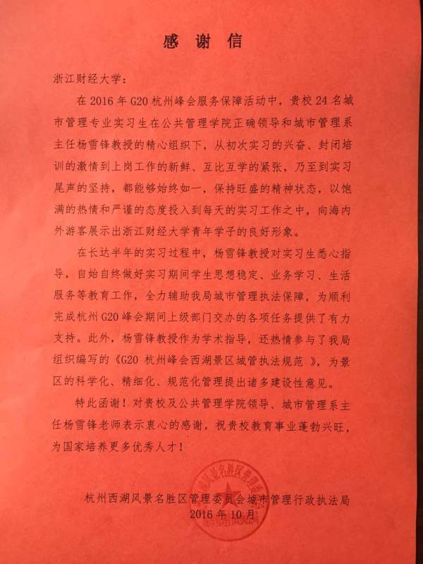 感谢信指出,我校选送的24名城市管理专业实习生以饱满的热情和严谨的态度投入到每天工作中,全力辅助城市管理执法保障,为顺利完成G20杭州峰会期间上级部门交办的各项任务提供了有力支持,向海内外游客展示了浙财学子的良好形象。执法局对学院领导的大力支持和城市管理系的精心组织表示衷心感谢,同时,也对CBA在线直播