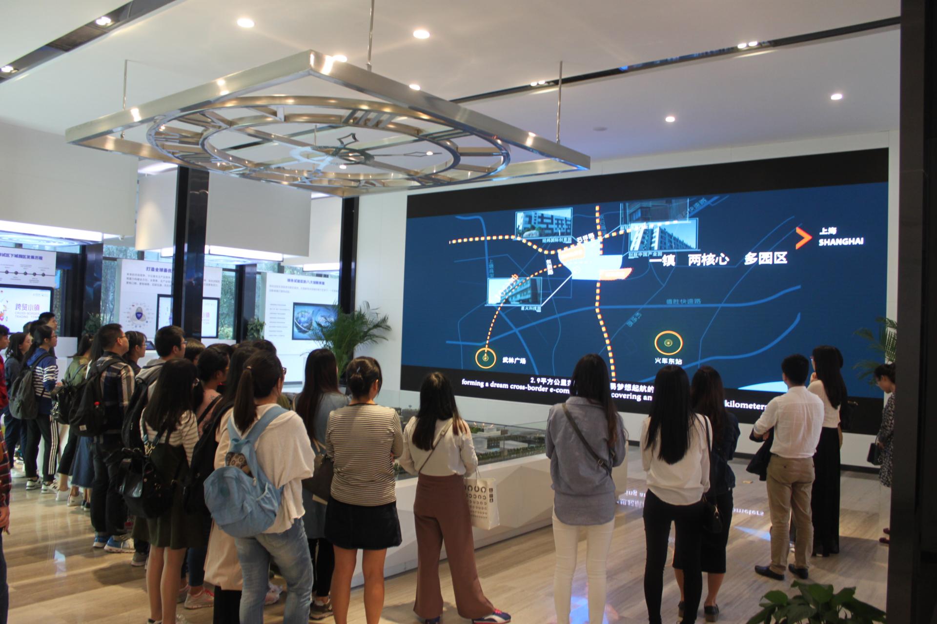 师生党员一行首先来到“跨贸小镇”展示厅。在工作人员的引导和讲解下,大家详细了解了跨贸小镇的发展成果及未来规划。在跨境电商综试区这个全新的领域里,下城是全国的先行区,而“跨贸小镇”又是其重点打造的核心基地和品牌。目前该区域正在加快产业集聚,推动经济转型升级,逐步建设形成“一核一圈一带,全域覆盖”的总体布局,致力于将小镇打造成具有全国乃至全球影响力和辐射力的新型跨贸产业功能区。