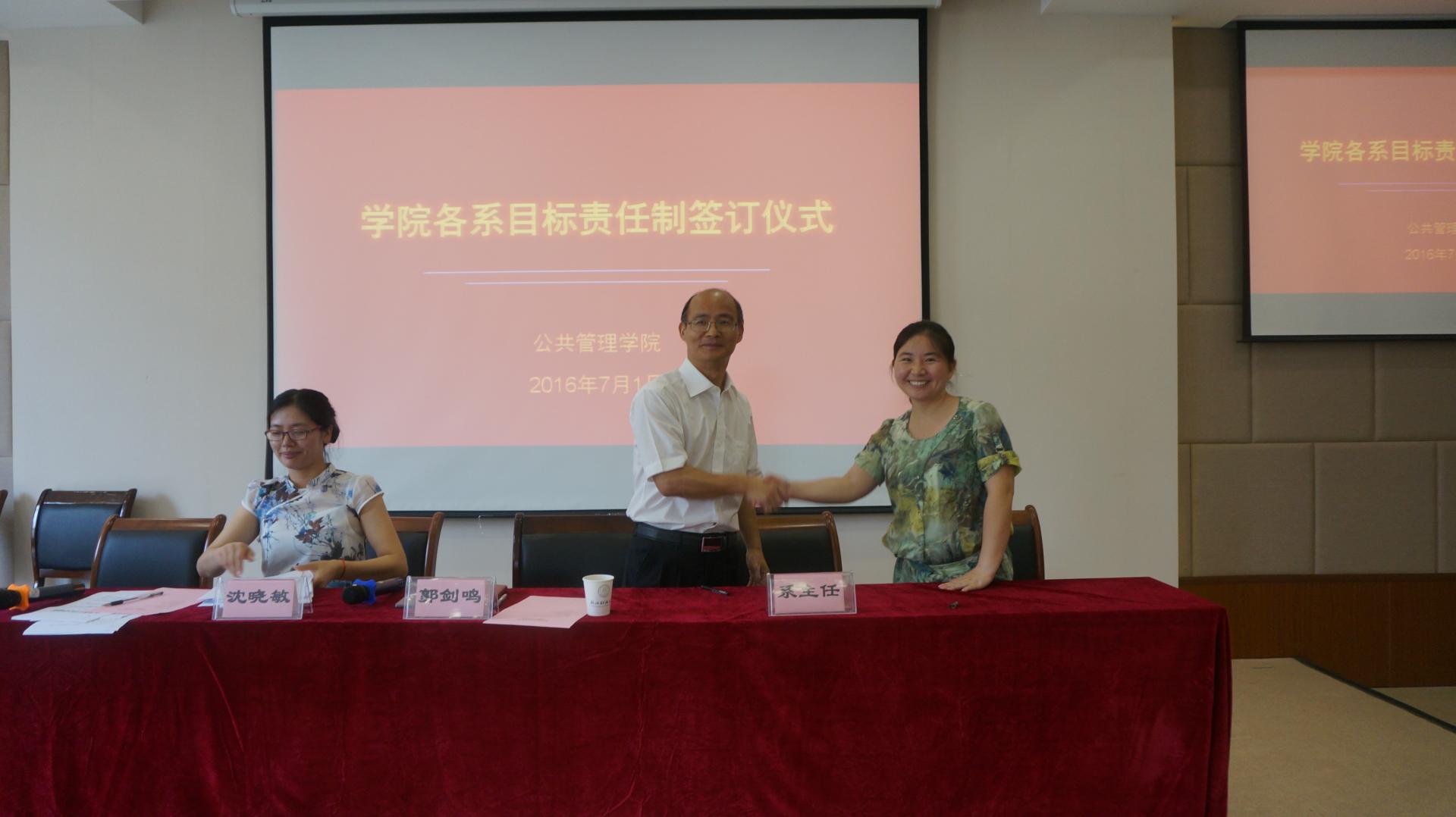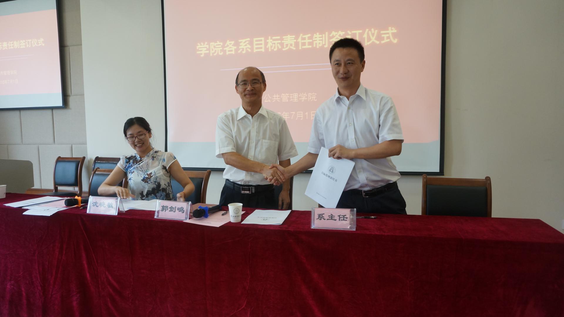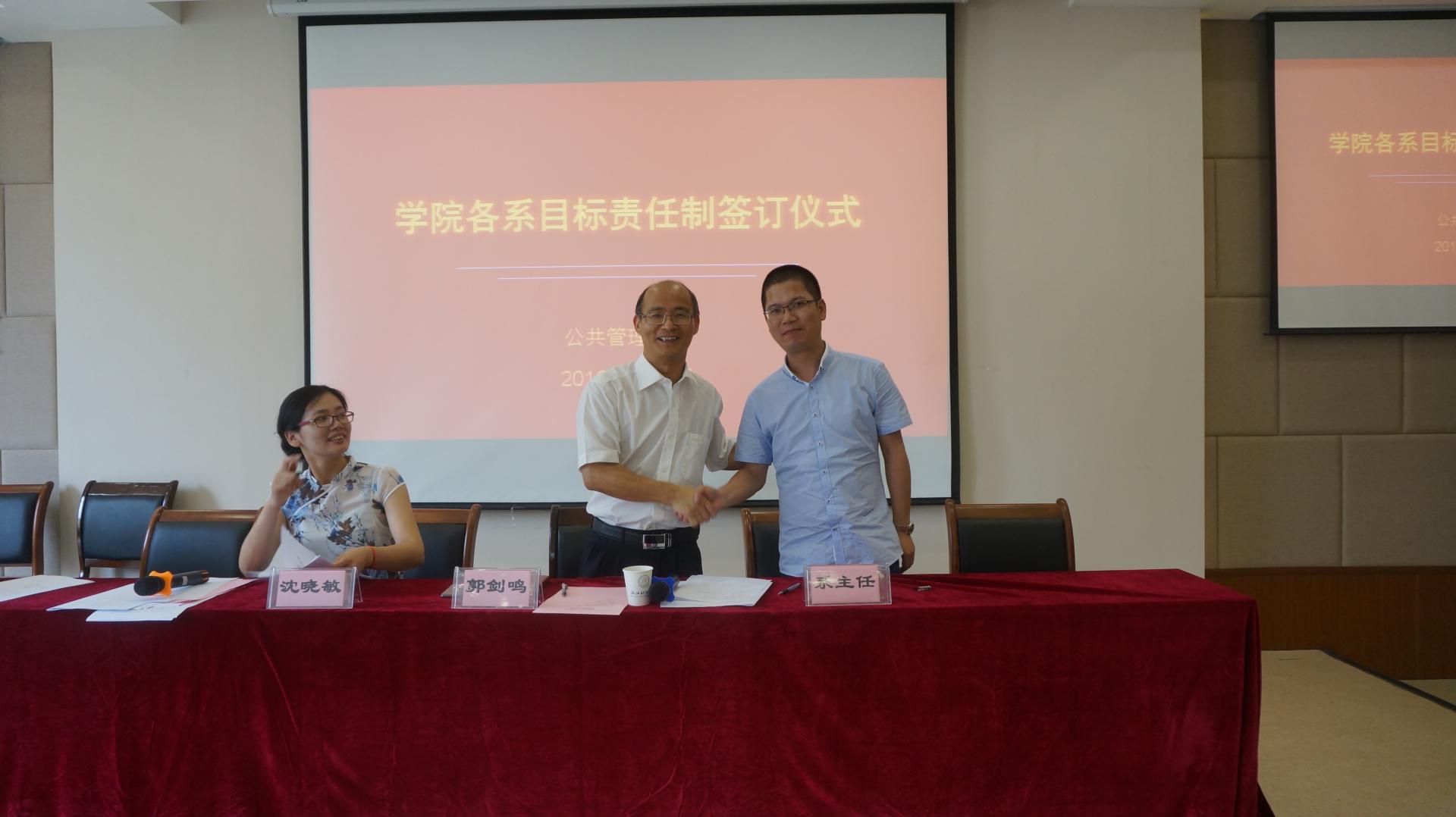 大会第二阶段,院长郭剑鸣、党委书记沈晓敏与各责任系系主任分别签订目标责任书。会上沈晓敏书记说明了学院的总体指标情况,解释了各系目标责任的设计原则,回顾了各系目标责任书“三上三下”的编制过程。此次目标责任书的签订,由学院党政联席会议和各责任系反复沟通决定,是学院各项约束性指标的层层分解和具体落实。目的是希望通过签订仪式,让各系更加明确自身工作的责任和压力,增加全体教师的大局意识和责任意识,统一思想,提高认识,理清思路,推动学院各项工作再上新台阶。