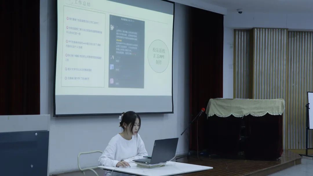 随后,由各部门及协会负责人上台总结本学期的工作,从学期工作展开,指出本学期工作的内容、进步以及不足,并讲解了对未来部门及协会发展的总体规划,也表达了对本部门、协会干事的鼓励和肯定。