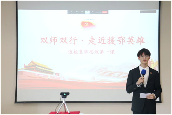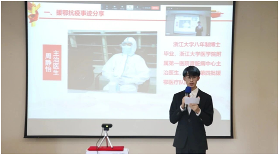 于5月19日下午,组织开展“双师双行·走近援鄂英雄” 线上主题党日暨返校思政第一课活动。与会人员有院党委书记沈晓敏和院党委副书记程晓东,邀请浙医一院主治医生周静怡、浙江省中医院主管护师余娅娟两位浙江省援鄂医疗队的医护人员,以及社区防控志愿者叶洋天和施禹鳞同学在线分享战“疫”故事,为广大党员、青年学生量身打造了返校“精神大餐”。本次活动采取线上直播与线下同时开展的形式。