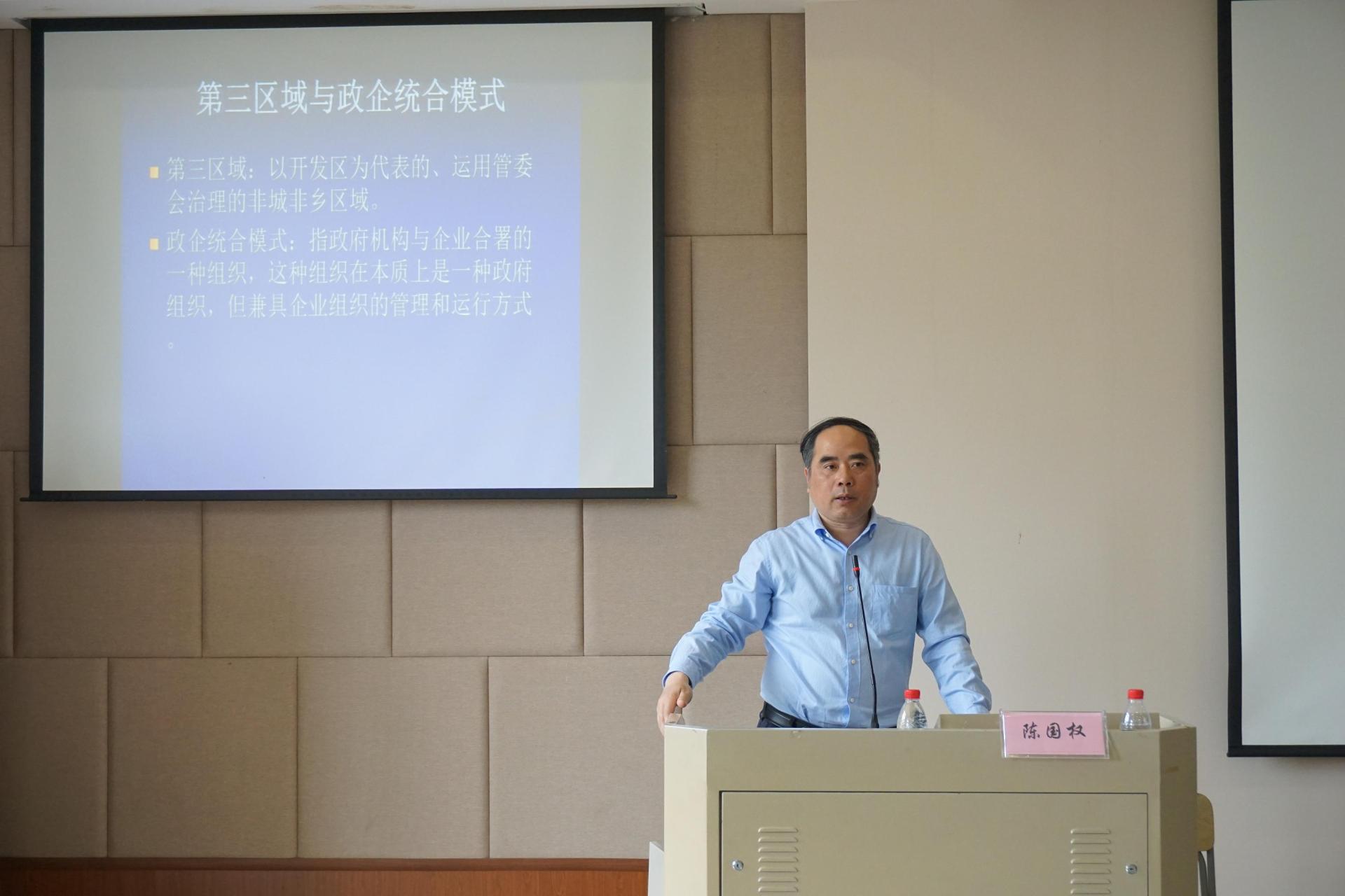 陈国权教授分析了西方经济具有波动性,时常出现经济回调的现象,提出了“为什么中国经济增长能够按政府计划目标完成”这一问题,引出了“我国客观上存在政府经济增长管理制度,我国改革开放以来GDP超平稳高速增长与政府的经济增长管理密切相关”的观点。他介绍了第三区域与政企统合模式,以及政企统合模式的特征,解释了我国政府的经济增长管理促进经济平稳快速发展的原因,并与学院师生共同就GDP增长指标、监督者与被监督者之间的不对称及政企分开到政企统合模式的发展逻辑关系这三个问题开展了热烈地讨论,指出了监督者的监督以及以经济建设为中心的政府治理逻辑。