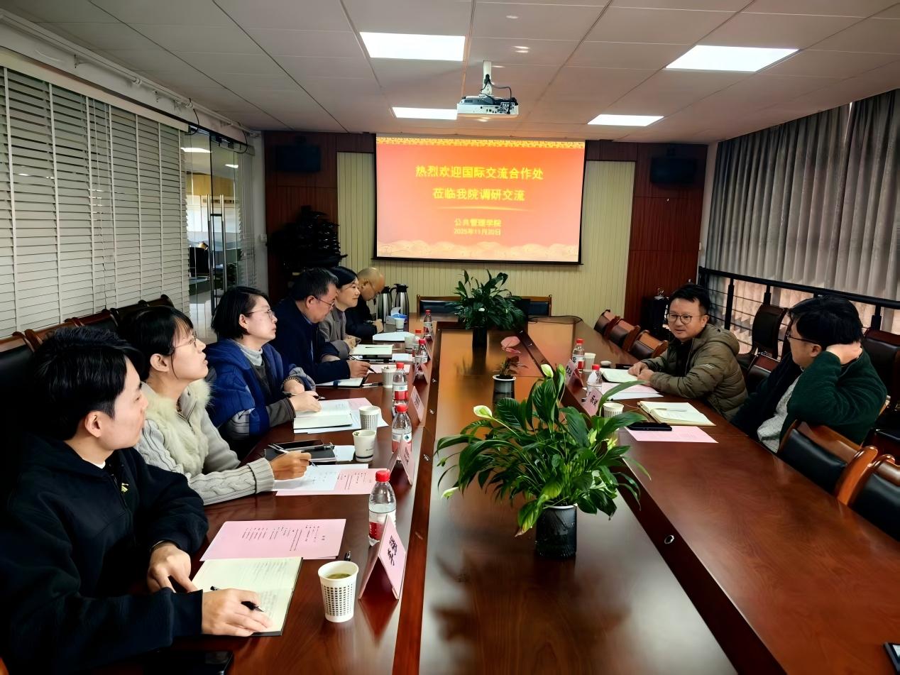 11月20日,学校国际交流合作处处长黄文礼、副处长乐斌一行莅临我院开展调研交流。学院院长史云贵、党委书记林亚芳、副院长祝锦霞、学科办主任郭玉飞、城市管理系王萌等教师代表参加交流座谈,座谈会由祝锦霞副院长主持。