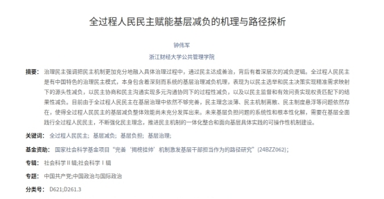 论文题目: 全过程人民民主赋能基层减负的机理与路径探析