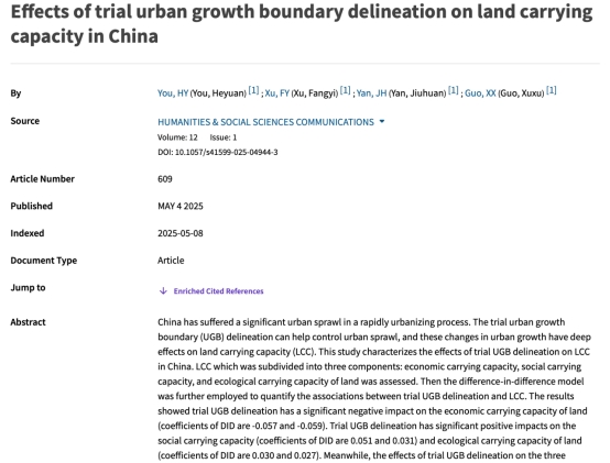 土地资源管理系教师游和远教授撰写的论文《Effects of trial urban growth boundary delineation on land carrying capacity in China》被《Humanities & Social Sciences Communications》录用并发表。