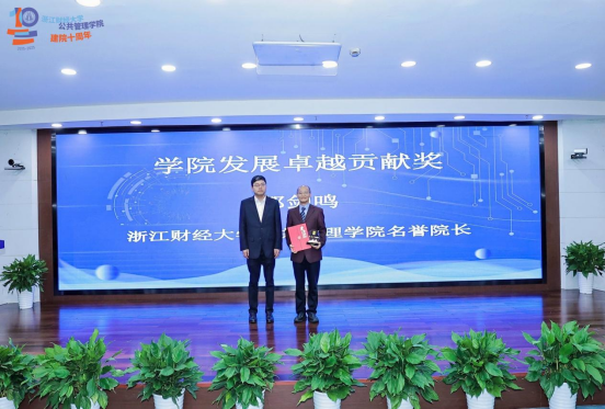 会上,浙江财经大学副校长何贤杰教授为14位“公共管理学院突出贡献奖”获得者颁奖,并授予名誉院长郭剑鸣“卓越贡献奖”,表彰郭剑鸣院长为学院发展做出的卓越贡献。郭剑鸣代表获奖教师发言,他表示学院十年发展得益于国家治理现代化的时代机遇、浙江创新的沃土和学校开放包容的领导们支持。衷心感谢公管学科评议组、教指委的引领,兄弟院校的倾囊相助,更离不开学院全体师生的艰苦努力。