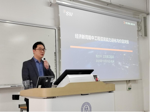 特邀建信永中和工程管理有限公司合伙人、杭州分公司负责人、教授级高工陈方平先生,为师生带来题为《经济新周期中工程咨询能力进化与价值突围》的专题演讲。陈方平教授系统阐述了当前工程咨询行业的发展现状,深入剖析了新经济周期下面临的挑战与信永中和的应对策略,并结合自身经验,就大学生提升职场胜任力、养成终身学习习惯以及增强经济周期适应能力等方面提出了宝贵建议。