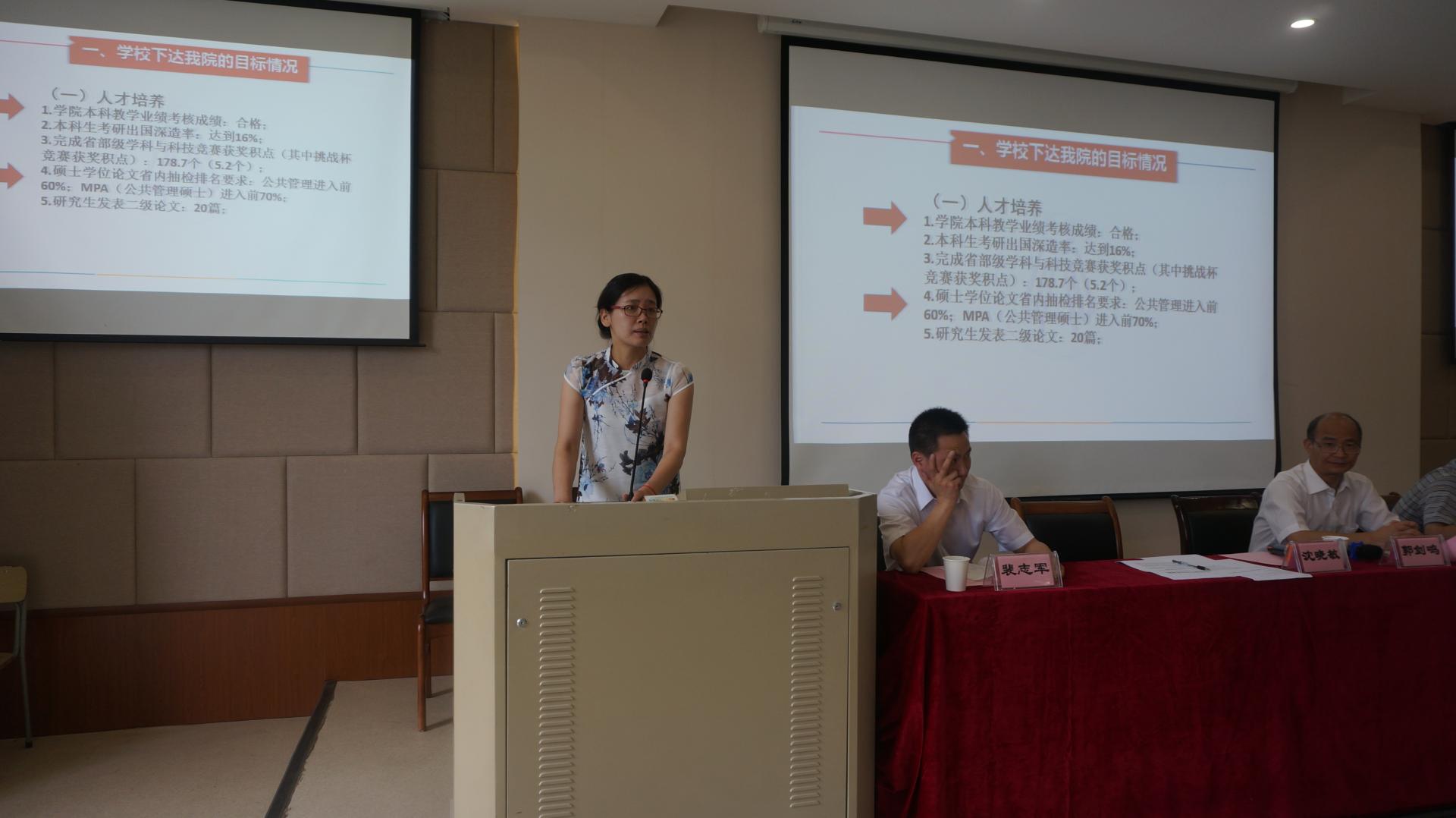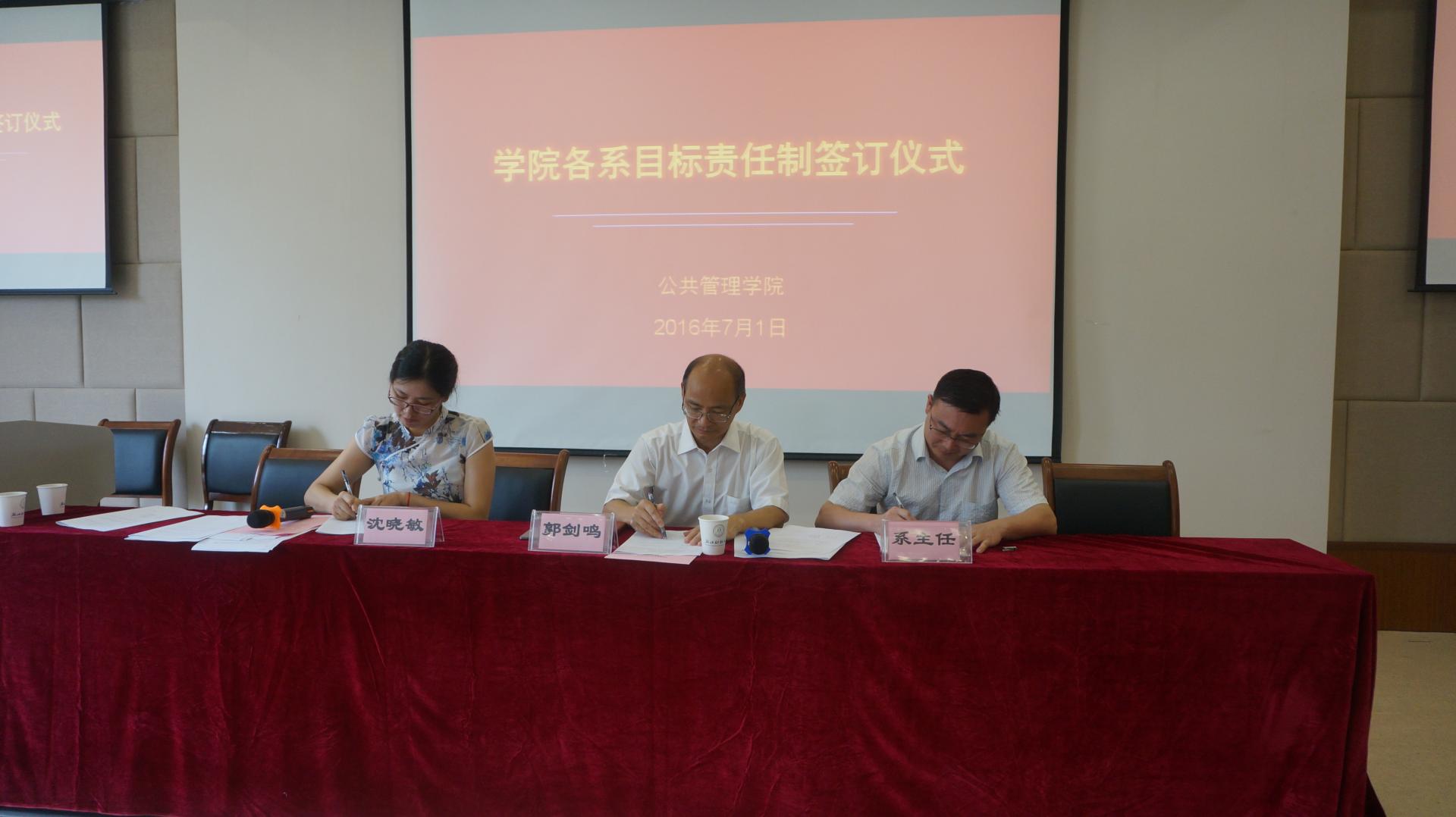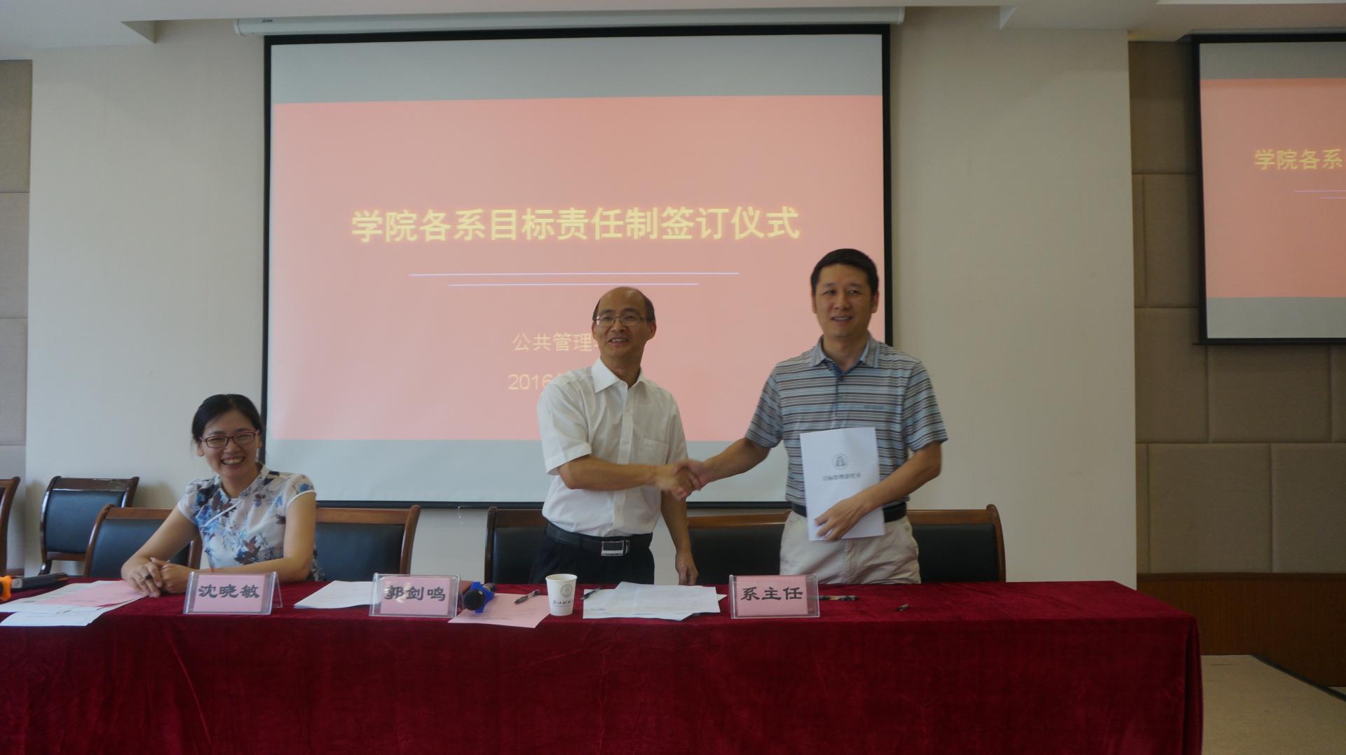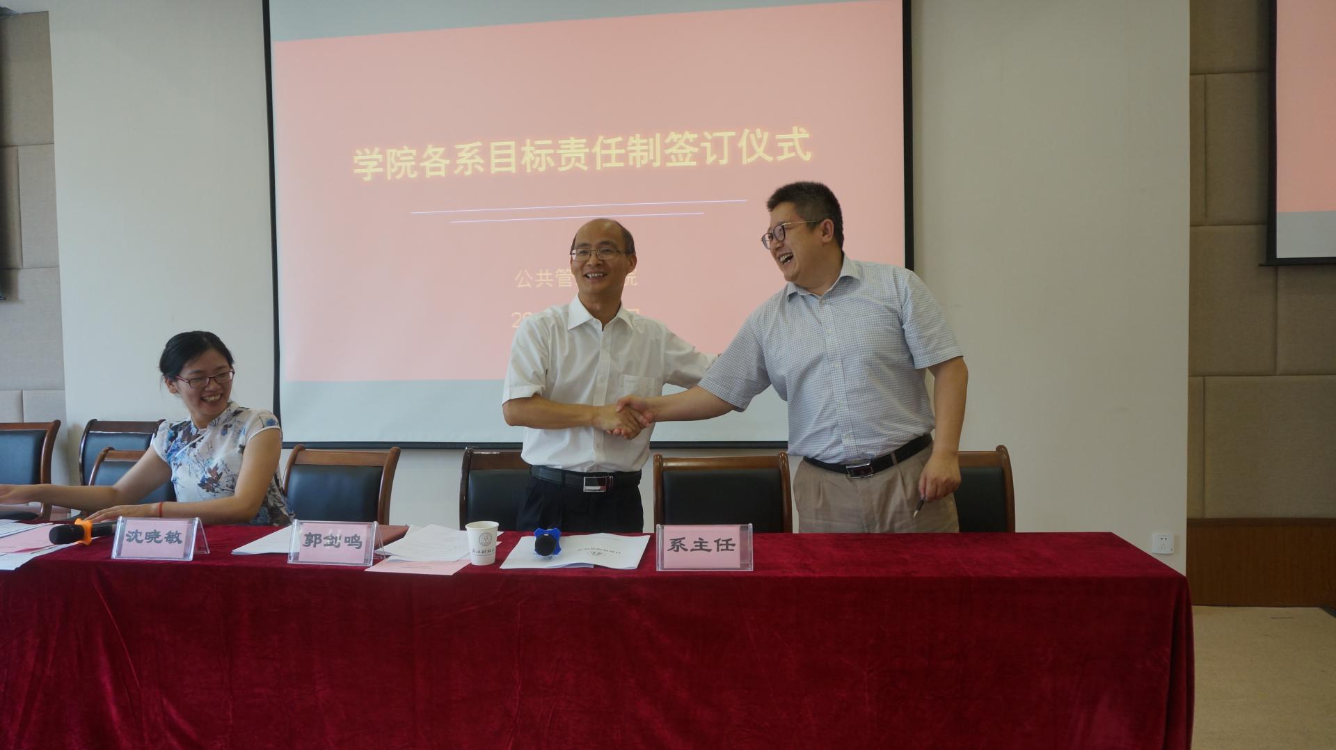 大会第二阶段,院长郭剑鸣、党委书记沈晓敏与各责任系系主任分别签订目标责任书。会上沈晓敏书记说明了学院的总体指标情况,解释了各系目标责任的设计原则,回顾了各系目标责任书“三上三下”的编制过程。此次目标责任书的签订,由学院党政联席会议和各责任系反复沟通决定,是学院各项约束性指标的层层分解和具体落实。目的是希望通过签订仪式,让各系更加明确自身工作的责任和压力,增加全体教师的大局意识和责任意识,统一思想,提高认识,理清思路,推动学院各项工作再上新台阶。