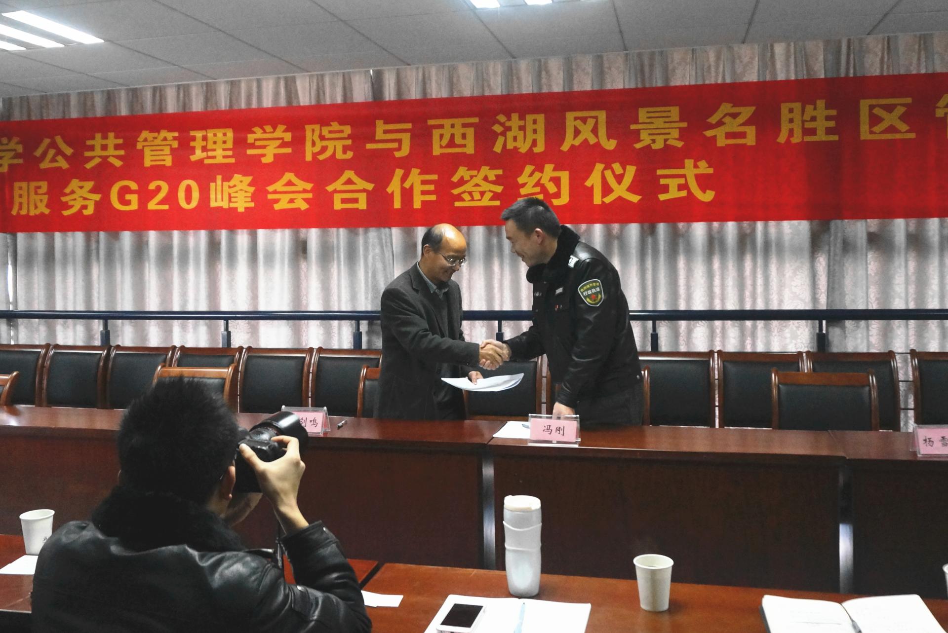 与杭州西湖风景名胜区城市管理行政执法局“服务G20峰会”合作签约仪式在一号学院楼举行,双方正式签订城市管理G20保障实习实训协议书。这是国内城市管理部门首次和大学进行合作。