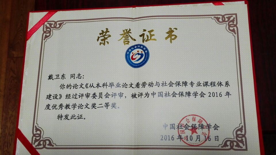 戴卫东教授向大会提交了教研论文,题目是《从本科生毕业论文看劳动与社会保障专业课程体系建设——以浙江财经大学为例》。15日下午戴卫东教授在“课程建设分论坛”上交流了本论文,重点介绍了浙江财经大学劳动与社会保障专业的发展历程以及课程体系建设取得的进步。该论文被评为中国社会保障学会2016年度“优秀教学论文奖二等奖”。